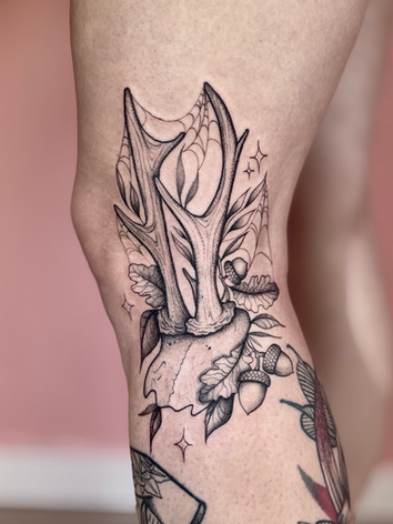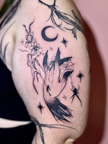 Wenn ich nicht tätowiere, findest du mich meistens mit der Nase in einem Buch, zwischen meinen Zimmerpflanzen oder auf Schatzsuche nach „witchy stuff“ – präparierte Tiere, Edelsteine, kleine Fundstücke, die Geschichten erzählen.
